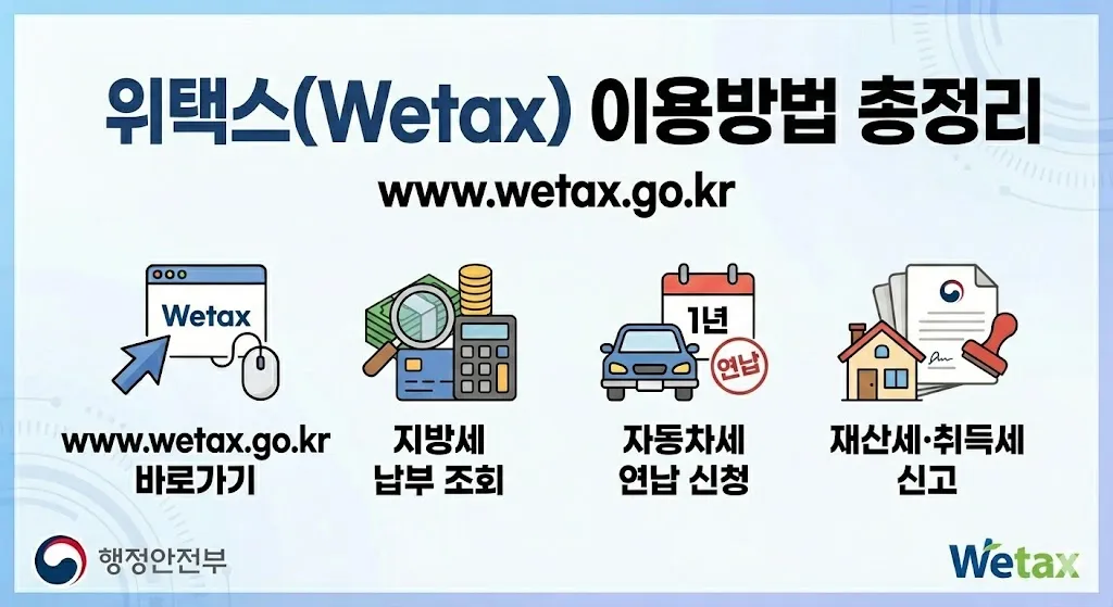위택스(Wetax) 홈페이지(www.wetax.go.kr)를 찾고 계신가요? 자동차세, 재산세, 취득세 등 지방세를 관공서 방문 없이 온라인으로 간편하게 납부하고 싶은 분들이 많습니다. 이 글에서는 위택스 홈페이지 바로가기, 지방세 조회 및 납부 방법, 자동차세 연납 신청, 각종 증명서 발급까지 상세히 정리해드립니다.